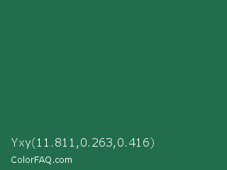 Yxy 11.811,0.263,0.416 Color is a dark green color and the nearest color is Dark Spring Green #177245. Hex code #216d4e and RGB value is rgb(33,109,78). In RGB color space, this color is composed of 13% red, 43% green, 31% blue, In CMYK color space, this color is composed of 70% cyan, 0% magenta, 28% yellow , 57% black , In HSL color space, this color has a hue angle of 156° , 54% saturation and 28% lightness.