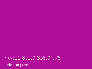 Yxy 11.811,0.358,0.178 Color is a normal magenta color and the nearest color is Violet Eggplant #991199. Hex code #b00d98 and RGB value is rgb(176,13,152). In RGB color space, this color is composed of 69% red, 5% green, 60% blue, In CMYK color space, this color is composed of 0% cyan, 93% magenta, 14% yellow , 31% black , In HSL color space, this color has a hue angle of 309° , 86% saturation and 37% lightness.