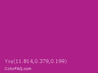 Yxy 11.814,0.379,0.199 Color is a normal magenta color and the nearest color is Fandango #b53389. Hex code #ae1f8a and RGB value is rgb(174,31,138). In RGB color space, this color is composed of 68% red, 12% green, 54% blue, In CMYK color space, this color is composed of 0% cyan, 82% magenta, 21% yellow , 32% black , In HSL color space, this color has a hue angle of 315° , 70% saturation and 40% lightness.