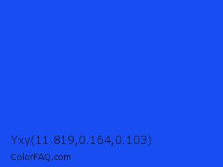 Yxy 11.819,0.164,0.103 Color is a normal blue color and the nearest color is Blue RYB #0247fe. Hex code #174df1 and RGB value is rgb(23,77,241). In RGB color space, this color is composed of 9% red, 30% green, 95% blue, In CMYK color space, this color is composed of 90% cyan, 68% magenta, 0% yellow , 5% black , In HSL color space, this color has a hue angle of 225° , 89% saturation and 52% lightness.