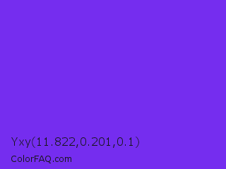 Yxy 11.822,0.201,0.1 Color is a normal violet color and the nearest color is Blue Violet #8a2be2. Hex code #752def and RGB value is rgb(117,45,239). In RGB color space, this color is composed of 46% red, 18% green, 94% blue, In CMYK color space, this color is composed of 51% cyan, 81% magenta, 0% yellow , 6% black , In HSL color space, this color has a hue angle of 262° , 86% saturation and 56% lightness.