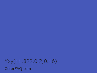 Yxy 11.822,0.2,0.16 Color is a normal blue color and the nearest color is Liberty #545aa7. Hex code #4658b9 and RGB value is rgb(70,88,185). In RGB color space, this color is composed of 27% red, 35% green, 73% blue, In CMYK color space, this color is composed of 62% cyan, 52% magenta, 0% yellow , 27% black , In HSL color space, this color has a hue angle of 231° , 45% saturation and 50% lightness.