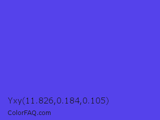 Yxy 11.826,0.184,0.105 Color is a normal indigo color and the nearest color is Majorelle Blue #6050dc. Hex code #5542eb and RGB value is rgb(85,66,235). In RGB color space, this color is composed of 33% red, 26% green, 92% blue, In CMYK color space, this color is composed of 64% cyan, 72% magenta, 0% yellow , 8% black , In HSL color space, this color has a hue angle of 247° , 81% saturation and 59% lightness.