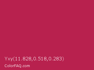 Yxy 11.828,0.518,0.283 Color is a normal rose color and the nearest color is Maroon Flush #c32148. Hex code #b8214e and RGB value is rgb(184,33,78). In RGB color space, this color is composed of 72% red, 13% green, 31% blue, In CMYK color space, this color is composed of 0% cyan, 82% magenta, 58% yellow , 28% black , In HSL color space, this color has a hue angle of 342° , 70% saturation and 43% lightness.