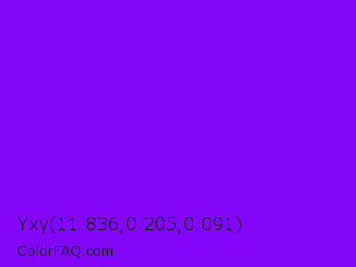 Yxy 11.836,0.205,0.091 Color is a normal purple color and the nearest color is Violet Color Wheel #7f00ff. Hex code #8305fa and RGB value is rgb(131,5,250). In RGB color space, this color is composed of 51% red, 2% green, 98% blue, In CMYK color space, this color is composed of 48% cyan, 98% magenta, 0% yellow , 2% black , In HSL color space, this color has a hue angle of 271° , 96% saturation and 50% lightness.