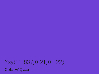 Yxy 11.837,0.21,0.122 Color is a normal indigo color and the nearest color is Majorelle Blue #6050dc. Hex code #6e40d6 and RGB value is rgb(110,64,214). In RGB color space, this color is composed of 43% red, 25% green, 84% blue, In CMYK color space, this color is composed of 49% cyan, 70% magenta, 0% yellow , 16% black , In HSL color space, this color has a hue angle of 258° , 65% saturation and 55% lightness.