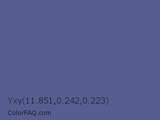 Yxy 11.851,0.242,0.223 Color is a normal blue color and the nearest color is UCLA Blue #536895. Hex code #565d91 and RGB value is rgb(86,93,145). In RGB color space, this color is composed of 34% red, 36% green, 57% blue, In CMYK color space, this color is composed of 41% cyan, 36% magenta, 0% yellow , 43% black , In HSL color space, this color has a hue angle of 233° , 26% saturation and 45% lightness.