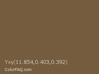 Yxy 11.854,0.403,0.392 Color is a normal orange color and the nearest color is Tobacco Brown #715d47. Hex code #765c3e and RGB value is rgb(118,92,62). In RGB color space, this color is composed of 46% red, 36% green, 24% blue, In CMYK color space, this color is composed of 0% cyan, 22% magenta, 47% yellow , 54% black , In HSL color space, this color has a hue angle of 32° , 31% saturation and 35% lightness.