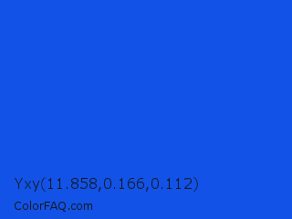 Yxy 11.858,0.166,0.112 Color is a normal blue color and the nearest color is Blue RYB #0247fe. Hex code #1252e6 and RGB value is rgb(18,82,230). In RGB color space, this color is composed of 7% red, 32% green, 90% blue, In CMYK color space, this color is composed of 92% cyan, 64% magenta, 0% yellow , 10% black , In HSL color space, this color has a hue angle of 222° , 85% saturation and 49% lightness.