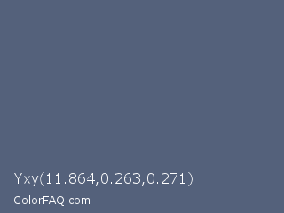 Yxy 11.864,0.263,0.271 Color is a normal blue color and the nearest color is Paynes Grey #536878. Hex code #54617b and RGB value is rgb(84,97,123). In RGB color space, this color is composed of 33% red, 38% green, 48% blue, In CMYK color space, this color is composed of 32% cyan, 21% magenta, 0% yellow , 52% black , In HSL color space, this color has a hue angle of 220° , 19% saturation and 41% lightness.