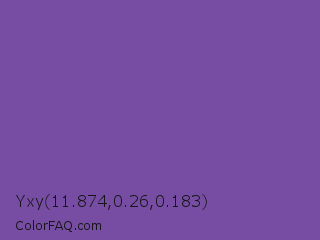 Yxy 11.874,0.26,0.183 Color is a normal violet color and the nearest color is Royal Purple #7851a9. Hex code #774da3 and RGB value is rgb(119,77,163). In RGB color space, this color is composed of 47% red, 30% green, 64% blue, In CMYK color space, this color is composed of 27% cyan, 53% magenta, 0% yellow , 36% black , In HSL color space, this color has a hue angle of 269° , 36% saturation and 47% lightness.