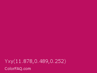 Yxy 11.878,0.489,0.252 Color is a normal rose color and the nearest color is Lipstick #ab0563. Hex code #bc0e60 and RGB value is rgb(188,14,96). In RGB color space, this color is composed of 74% red, 5% green, 38% blue, In CMYK color space, this color is composed of 0% cyan, 93% magenta, 49% yellow , 26% black , In HSL color space, this color has a hue angle of 332° , 86% saturation and 40% lightness.