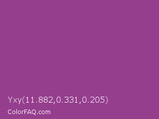 Yxy 11.882,0.331,0.205 Color is a normal magenta color and the nearest color is Plum #8e4585. Hex code #963e8e and RGB value is rgb(150,62,142). In RGB color space, this color is composed of 59% red, 24% green, 56% blue, In CMYK color space, this color is composed of 0% cyan, 59% magenta, 5% yellow , 41% black , In HSL color space, this color has a hue angle of 305° , 42% saturation and 42% lightness.
