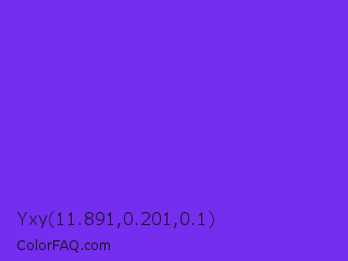 Yxy 11.891,0.201,0.1 Color is a normal violet color and the nearest color is Blue Violet #8a2be2. Hex code #752df0 and RGB value is rgb(117,45,240). In RGB color space, this color is composed of 46% red, 18% green, 94% blue, In CMYK color space, this color is composed of 51% cyan, 81% magenta, 0% yellow , 6% black , In HSL color space, this color has a hue angle of 262° , 87% saturation and 56% lightness.