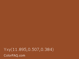 Yxy 11.895,0.507,0.384 Color is a normal orange color and the nearest color is Cumin #924321. Hex code #974c27 and RGB value is rgb(151,76,39). In RGB color space, this color is composed of 59% red, 30% green, 15% blue, In CMYK color space, this color is composed of 0% cyan, 50% magenta, 74% yellow , 41% black , In HSL color space, this color has a hue angle of 20° , 59% saturation and 37% lightness.