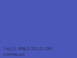 Yxy 11.898,0.203,0.158 Color is a normal blue color and the nearest color is Liberty #545aa7. Hex code #4c57ba and RGB value is rgb(76,87,186). In RGB color space, this color is composed of 30% red, 34% green, 73% blue, In CMYK color space, this color is composed of 59% cyan, 53% magenta, 0% yellow , 27% black , In HSL color space, this color has a hue angle of 234° , 44% saturation and 51% lightness.