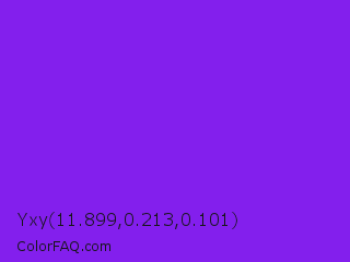 Yxy 11.899,0.213,0.101 Color is a normal violet color and the nearest color is Blue Violet #8a2be2. Hex code #831fed and RGB value is rgb(131,31,237). In RGB color space, this color is composed of 51% red, 12% green, 93% blue, In CMYK color space, this color is composed of 45% cyan, 87% magenta, 0% yellow , 7% black , In HSL color space, this color has a hue angle of 269° , 85% saturation and 53% lightness.