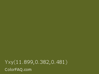 Yxy 11.899,0.382,0.481 Color is a dark yellow color and the nearest color is Antique Bronze #665d1e. Hex code #5c6623 and RGB value is rgb(92,102,35). In RGB color space, this color is composed of 36% red, 40% green, 14% blue, In CMYK color space, this color is composed of 10% cyan, 0% magenta, 66% yellow , 60% black , In HSL color space, this color has a hue angle of 69° , 49% saturation and 27% lightness.