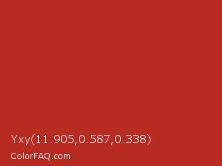 Yxy 11.905,0.587,0.338 Color is a normal red color and the nearest color is Tall Poppy #b32d29. Hex code #b72b21 and RGB value is rgb(183,43,33). In RGB color space, this color is composed of 72% red, 17% green, 13% blue, In CMYK color space, this color is composed of 0% cyan, 77% magenta, 82% yellow , 28% black , In HSL color space, this color has a hue angle of 4° , 69% saturation and 42% lightness.