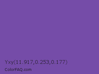 Yxy 11.917,0.253,0.177 Color is a normal violet color and the nearest color is Royal Purple #7851a9. Hex code #754da8 and RGB value is rgb(117,77,168). In RGB color space, this color is composed of 46% red, 30% green, 66% blue, In CMYK color space, this color is composed of 30% cyan, 54% magenta, 0% yellow , 34% black , In HSL color space, this color has a hue angle of 266° , 37% saturation and 48% lightness.