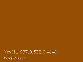 Yxy 11.937,0.532,0.414 Color is a dark orange color and the nearest color is Brown #964b00. Hex code #964e02 and RGB value is rgb(150,78,2). In RGB color space, this color is composed of 59% red, 31% green, 1% blue, In CMYK color space, this color is composed of 0% cyan, 48% magenta, 99% yellow , 41% black , In HSL color space, this color has a hue angle of 31° , 97% saturation and 30% lightness.