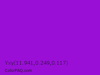 Yxy 11.941,0.249,0.117 Color is a normal purple color and the nearest color is Dark Violet #9400d3. Hex code #990fd6 and RGB value is rgb(153,15,214). In RGB color space, this color is composed of 60% red, 6% green, 84% blue, In CMYK color space, this color is composed of 29% cyan, 93% magenta, 0% yellow , 16% black , In HSL color space, this color has a hue angle of 282° , 87% saturation and 45% lightness.