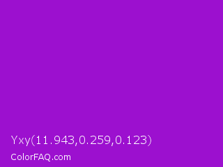 Yxy 11.943,0.259,0.123 Color is a normal purple color and the nearest color is Dark Violet #9400d3. Hex code #9c10cf and RGB value is rgb(156,16,207). In RGB color space, this color is composed of 61% red, 6% green, 81% blue, In CMYK color space, this color is composed of 25% cyan, 92% magenta, 0% yellow , 19% black , In HSL color space, this color has a hue angle of 284° , 86% saturation and 44% lightness.