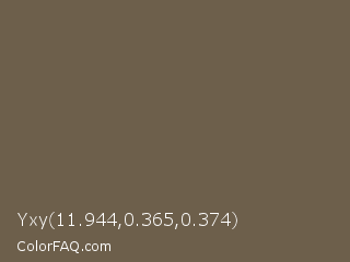Yxy 11.944,0.365,0.374 Color is a normal orange color and the nearest color is Tobacco Brown #715d47. Hex code #6d5f4b and RGB value is rgb(109,95,75). In RGB color space, this color is composed of 43% red, 37% green, 29% blue, In CMYK color space, this color is composed of 0% cyan, 13% magenta, 31% yellow , 57% black , In HSL color space, this color has a hue angle of 35° , 18% saturation and 36% lightness.