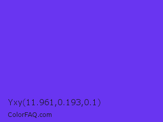 Yxy 11.961,0.193,0.1 Color is a normal indigo color and the nearest color is Majorelle Blue #6050dc. Hex code #6935f1 and RGB value is rgb(105,53,241). In RGB color space, this color is composed of 41% red, 21% green, 95% blue, In CMYK color space, this color is composed of 56% cyan, 78% magenta, 0% yellow , 5% black , In HSL color space, this color has a hue angle of 257° , 87% saturation and 58% lightness.