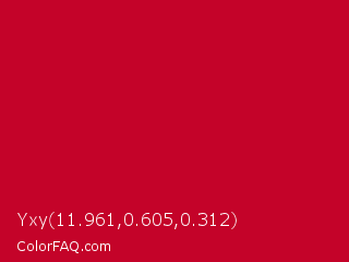 Yxy 11.961,0.605,0.312 Color is a normal red color and the nearest color is Red NCS #c40233. Hex code #c40329 and RGB value is rgb(196,3,41). In RGB color space, this color is composed of 77% red, 1% green, 16% blue, In CMYK color space, this color is composed of 0% cyan, 98% magenta, 79% yellow , 23% black , In HSL color space, this color has a hue angle of 348° , 97% saturation and 39% lightness.