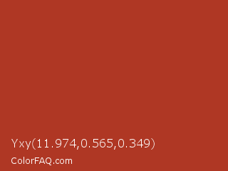Yxy 11.974,0.565,0.349 Color is a normal red color and the nearest color is Chinese Red #aa381e. Hex code #af3724 and RGB value is rgb(175,55,36). In RGB color space, this color is composed of 69% red, 22% green, 14% blue, In CMYK color space, this color is composed of 0% cyan, 69% magenta, 79% yellow , 31% black , In HSL color space, this color has a hue angle of 8° , 66% saturation and 41% lightness.