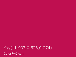 Yxy 11.997,0.528,0.274 Color is a normal rose color and the nearest color is Pictorial Carmine #c30b4e. Hex code #bf0f50 and RGB value is rgb(191,15,80). In RGB color space, this color is composed of 75% red, 6% green, 31% blue, In CMYK color space, this color is composed of 0% cyan, 92% magenta, 58% yellow , 25% black , In HSL color space, this color has a hue angle of 338° , 85% saturation and 40% lightness.