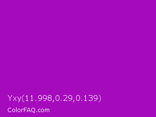 Yxy 11.998,0.29,0.139 Color is a normal magenta color and the nearest color is Heliotrope Magenta #aa00bb. Hex code #a60abd and RGB value is rgb(166,10,189). In RGB color space, this color is composed of 65% red, 4% green, 74% blue, In CMYK color space, this color is composed of 12% cyan, 95% magenta, 0% yellow , 26% black , In HSL color space, this color has a hue angle of 292° , 90% saturation and 39% lightness.