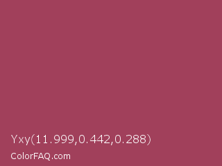 Yxy 11.999,0.442,0.288 Color is a normal rose color and the nearest color is Vin Rouge #983d61. Hex code #a1405b and RGB value is rgb(161,64,91). In RGB color space, this color is composed of 63% red, 25% green, 36% blue, In CMYK color space, this color is composed of 0% cyan, 60% magenta, 43% yellow , 37% black , In HSL color space, this color has a hue angle of 343° , 43% saturation and 44% lightness.