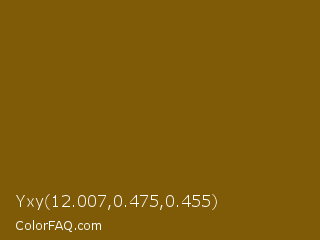 Yxy 12.007,0.475,0.455 Color is a dark orange color and the nearest color is Rusty Nail #86560a. Hex code #7f5b07 and RGB value is rgb(127,91,7). In RGB color space, this color is composed of 50% red, 36% green, 3% blue, In CMYK color space, this color is composed of 0% cyan, 28% magenta, 94% yellow , 50% black , In HSL color space, this color has a hue angle of 42° , 90% saturation and 26% lightness.