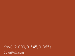 Yxy 12.009,0.545,0.365 Color is a normal red color and the nearest color is Chinese Red #aa381e. Hex code #a64123 and RGB value is rgb(166,65,35). In RGB color space, this color is composed of 65% red, 25% green, 14% blue, In CMYK color space, this color is composed of 0% cyan, 61% magenta, 79% yellow , 35% black , In HSL color space, this color has a hue angle of 14° , 65% saturation and 39% lightness.
