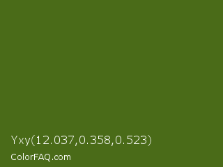 Yxy 12.037,0.358,0.523 Color is a dark green color and the nearest color is Green Leaf #436a0d. Hex code #4a6b18 and RGB value is rgb(74,107,24). In RGB color space, this color is composed of 29% red, 42% green, 9% blue, In CMYK color space, this color is composed of 31% cyan, 0% magenta, 78% yellow , 58% black , In HSL color space, this color has a hue angle of 84° , 63% saturation and 26% lightness.