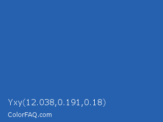 Yxy 12.038,0.191,0.18 Color is a normal blue color and the nearest color is Fun Blue #1959a8. Hex code #2661af and RGB value is rgb(38,97,175). In RGB color space, this color is composed of 15% red, 38% green, 69% blue, In CMYK color space, this color is composed of 78% cyan, 45% magenta, 0% yellow , 31% black , In HSL color space, this color has a hue angle of 214° , 64% saturation and 42% lightness.