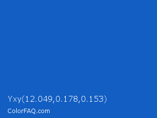 Yxy 12.049,0.178,0.153 Color is a normal blue color and the nearest color is Denim #1560bd. Hex code #135ec2 and RGB value is rgb(19,94,194). In RGB color space, this color is composed of 7% red, 37% green, 76% blue, In CMYK color space, this color is composed of 90% cyan, 52% magenta, 0% yellow , 24% black , In HSL color space, this color has a hue angle of 214° , 82% saturation and 42% lightness.