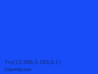 Yxy 12.066,0.163,0.1 Color is a normal blue color and the nearest color is Blue RYB #0247fe. Hex code #174cf7 and RGB value is rgb(23,76,247). In RGB color space, this color is composed of 9% red, 30% green, 97% blue, In CMYK color space, this color is composed of 91% cyan, 69% magenta, 0% yellow , 3% black , In HSL color space, this color has a hue angle of 226° , 93% saturation and 53% lightness.
