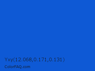 Yxy 12.068,0.171,0.131 Color is a normal blue color and the nearest color is Science Blue #0066cc. Hex code #0e59d5 and RGB value is rgb(14,89,213). In RGB color space, this color is composed of 5% red, 35% green, 84% blue, In CMYK color space, this color is composed of 93% cyan, 58% magenta, 0% yellow , 16% black , In HSL color space, this color has a hue angle of 217° , 88% saturation and 45% lightness.