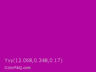 Yxy 12.068,0.348,0.17 Color is a normal magenta color and the nearest color is Heliotrope Magenta #aa00bb. Hex code #b204a0 and RGB value is rgb(178,4,160). In RGB color space, this color is composed of 70% red, 2% green, 63% blue, In CMYK color space, this color is composed of 0% cyan, 98% magenta, 10% yellow , 30% black , In HSL color space, this color has a hue angle of 306° , 96% saturation and 36% lightness.