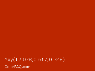 Yxy 12.078,0.617,0.348 Color is a normal red color and the nearest color is International Orange Engineering #ba160c. Hex code #bc2600 and RGB value is rgb(188,38,0). In RGB color space, this color is composed of 74% red, 15% green, 0% blue, In CMYK color space, this color is composed of 0% cyan, 80% magenta, 100% yellow , 26% black , In HSL color space, this color has a hue angle of 12° , 100% saturation and 37% lightness.