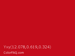 Yxy 12.078,0.619,0.324 Color is a normal red color and the nearest color is Venetian Red #c80815. Hex code #c40c1b and RGB value is rgb(196,12,27). In RGB color space, this color is composed of 77% red, 5% green, 11% blue, In CMYK color space, this color is composed of 0% cyan, 94% magenta, 86% yellow , 23% black , In HSL color space, this color has a hue angle of 355° , 88% saturation and 41% lightness.