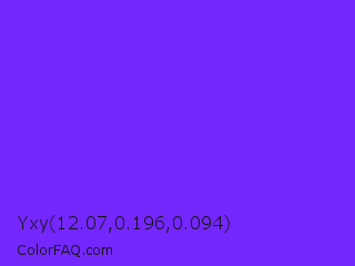 Yxy 12.07,0.196,0.094 Color is a normal violet color and the nearest color is Blue Violet #8a2be2. Hex code #7427fa and RGB value is rgb(116,39,250). In RGB color space, this color is composed of 45% red, 15% green, 98% blue, In CMYK color space, this color is composed of 54% cyan, 84% magenta, 0% yellow , 2% black , In HSL color space, this color has a hue angle of 262° , 95% saturation and 57% lightness.