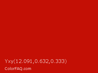 Yxy 12.091,0.632,0.333 Color is a normal red color and the nearest color is Milano Red #b81104. Hex code #c40f05 and RGB value is rgb(196,15,5). In RGB color space, this color is composed of 77% red, 6% green, 2% blue, In CMYK color space, this color is composed of 0% cyan, 92% magenta, 97% yellow , 23% black , In HSL color space, this color has a hue angle of 3° , 95% saturation and 39% lightness.