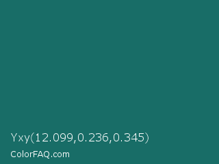 Yxy 12.099,0.236,0.345 Color is a dark cyan color and the nearest color is Genoa #15736b. Hex code #186d67 and RGB value is rgb(24,109,103). In RGB color space, this color is composed of 9% red, 43% green, 40% blue, In CMYK color space, this color is composed of 78% cyan, 0% magenta, 6% yellow , 57% black , In HSL color space, this color has a hue angle of 176° , 64% saturation and 26% lightness.
