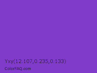 Yxy 12.107,0.235,0.133 Color is a normal violet color and the nearest color is Dark Orchid #9932cc. Hex code #813bcb and RGB value is rgb(129,59,203). In RGB color space, this color is composed of 51% red, 23% green, 80% blue, In CMYK color space, this color is composed of 36% cyan, 71% magenta, 0% yellow , 20% black , In HSL color space, this color has a hue angle of 269° , 58% saturation and 51% lightness.