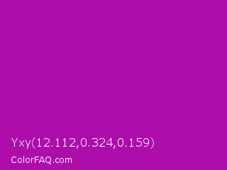Yxy 12.112,0.324,0.159 Color is a normal magenta color and the nearest color is Heliotrope Magenta #aa00bb. Hex code #ad0eab and RGB value is rgb(173,14,171). In RGB color space, this color is composed of 68% red, 5% green, 67% blue, In CMYK color space, this color is composed of 0% cyan, 92% magenta, 1% yellow , 32% black , In HSL color space, this color has a hue angle of 301° , 85% saturation and 37% lightness.