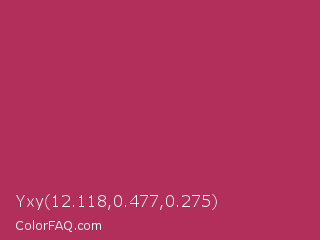 Yxy 12.118,0.477,0.275 Color is a normal rose color and the nearest color is Rich Maroon #b03060. Hex code #b12f5a and RGB value is rgb(177,47,90). In RGB color space, this color is composed of 69% red, 18% green, 35% blue, In CMYK color space, this color is composed of 0% cyan, 73% magenta, 49% yellow , 31% black , In HSL color space, this color has a hue angle of 340° , 58% saturation and 44% lightness.